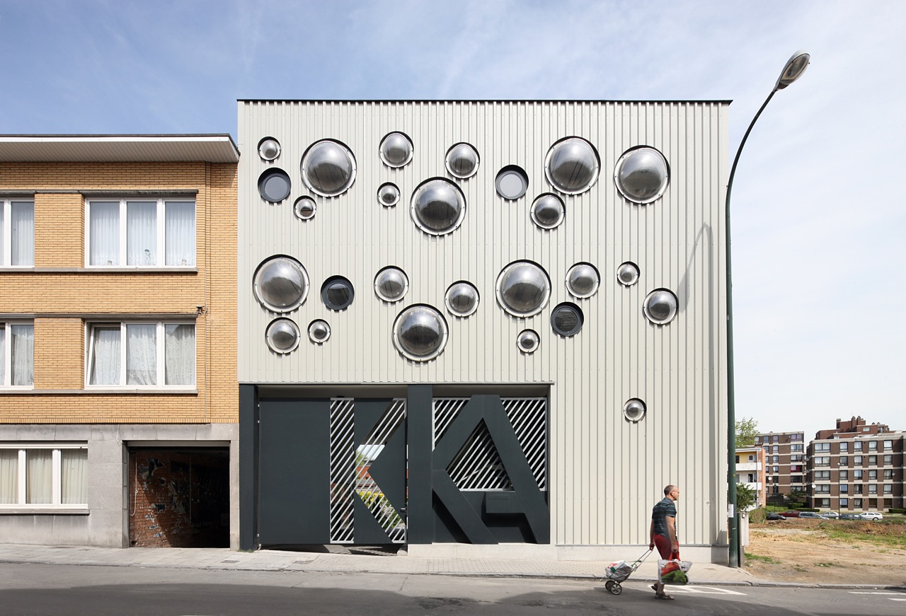 De buitengevels, een industriële bardage, zijn voorzien van ronde koepelramen. Een verwijzing naar het speelse van een lagere school. Dit geeft een bijzonder egale natuurlijke lichtinval en verspreiding.